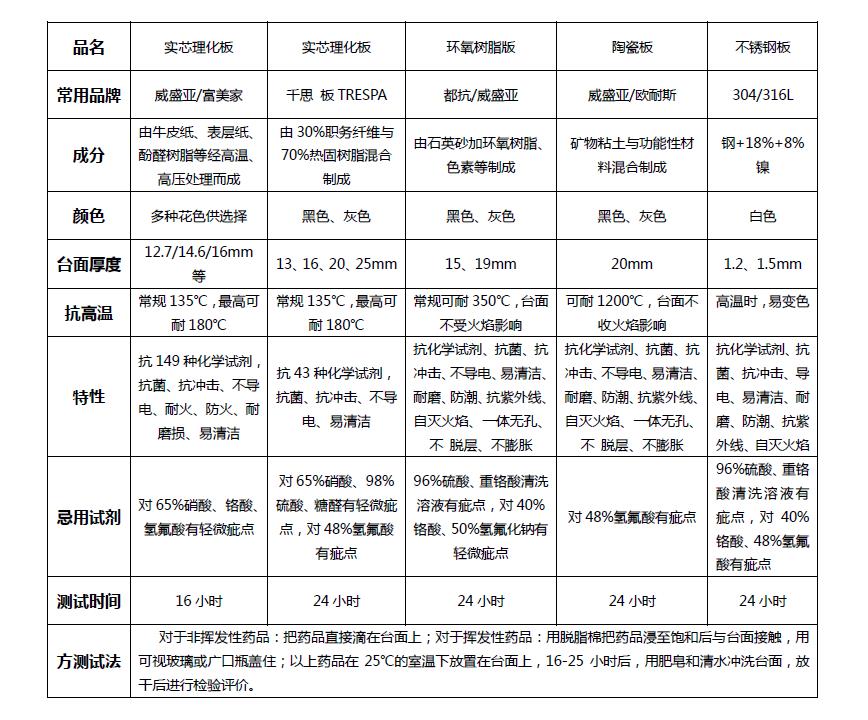 各類實驗室對於其試驗台、櫃等設備的操作麵板,除堅固耐用的基本要求之外,對於其化學性能及物理性能的要求也各有不同。本公司為符合其需求的多樣性,特提供一下多種實驗台麵板。